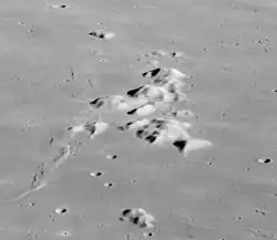 The Montes Spitzbergen (Spitzbergen Mountains) is a solitary mountain chain in the eastern Mare Imbrium of the Moon. It is located about 80 km to the north of the flooded crater Archimedes. The range trends from south to north, consisting of a number of peaks separated by lava-flooded valleys, and has a maximum width of about 25 km. It is thought to be the surviving rim or inner ring of an impact crater that has been buried under magma flows.