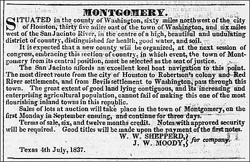 The town of Montgomery was founded in the middle of the Lake Creek Settlement by W. W. Shepperd in July 1837 on 200 acres of land that had originally been part of the John Corner League. Shepperd had established the first store in the Lake Creek Settlement in 1835. W. W. Shepperd and his partner John Wyatt Moody named the town Montgomery.[7]