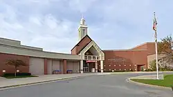 When Montgomery Blair High School's 23.5-acre (95,000 m2) Wayne Avenue campus opened in March 1935, it was the sixth high school in Montgomery County, and the first in the lower county.[6] One of several Montgomery County schools designed during that period by Howard Wright Cutler, the facility then consisted only of the C building, overlooking Sligo Creek. In 1936, the Auxiliary Gymnasium was added, followed by the B building in 1940, and the D building in 1942. MBHS's first football team was founded in 1944, and the War Memorial Stadium opened in 1947.[7] In 1950, the A building was constructed, containing the Blair Library/Media Center. With the addition of the Main Gymnasium/Fieldhouse in 1954, MBHS possessed one of the finest basketball and football facilities in the county.[8] The E building was added in 1959 as an administrative section, followed by the 1969 opening of the 1200-seat auditorium, named for long-time teacher and librarian Elizabeth Stickley.[9] The most recent addition was the automotive shop building in 1973.