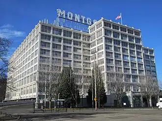 Retail service at this location was relatively limited in its first years. A 1936 expansion added retail space, covering a variety of goods, occupying a new mezzanine floor and parts of the 2nd and 3rd floors. A tire store was opened in an adjacent annex.[3] In the post-World War II years, the Vaughn Street store's business declined steadily. An increasing proportion of the store's customers were attracted to new suburban shopping malls, and in the early 1970s Montgomery Ward began to follow the same path itself, opening stores at Mall 205 and Jantzen Beach Mall, along with a stand-alone store in Beaverton.[3] The Northwest Portland store closed in July 1976, and the building remained in use only for warehouse and mail-order functions and as a "catalog overstock outlet".[3] In 1978, the company built a new warehouse in Portland's Rivergate Industrial District, and in 1982 it closed the Northwest Portland warehouse, eliminating 500 jobs at the site. Only the small "clearance outlet" store continued to operate,[5] and following the 1984 sale of the building, that store closed finally in July 1985.[8]