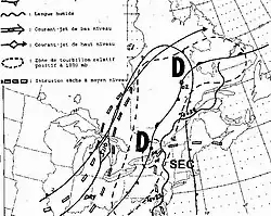 The map on the left shows the meteorological situation at 1200 UTC of the morning of July 14, 1987 (0800 local). The cold front at the border between Ontario and Quebec is supported by an intensifying barometric trough at 500 mb, and a low pressure is developing at the surface, just southwest of Ottawa, Ontario. Cumulonimbus with high tops were easily forming in the moist, humid and unstable air mass near the ground while drier air was cooling the air in the mid-tropospheric levels. A wind divergence at the upper level and a convergence near the surface, due to the low pressure, was helping to organize the deep convection.[3]