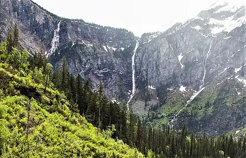 Monument Falls is a waterfall located in Glacier National Park, Montana, US. It descends from meltwater off Sperry Glacier en route to Avalanche Lake. Numerous other waterfalls are located in the immediate area, but they remain unnamed.[2][3]