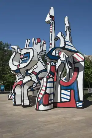Monument au Fantôme (English: Monument to the Phantom) is an outdoor sculpture by French sculptor Jean Dubuffet, in 1977. It was originally inaugurated at the plaza of 1100 Louisiana. It is installed on Avenida de las Americas at Discovery Green in Houston, Texas, United States, since 2008. The painted fiberglass and steel frame sculpture features seven individual forms that represent features of Houston, including a chimney, church, dog, hedge, mast, phantom, and tree. Donated by the Dan Duncan family, it is part of Dubuffet's Hourloupe series, which has companion sculptures in Chicago, New York, and in Europe.[1]