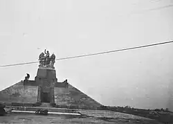 Souhain Maxime Real del Sarte's composition features a group of three soldiers in "attack" mode. Reportedly the soldier in the centre was meant to represent a likeness of General Gouraud. The soldier on the right was supposedly based on Quentin Roosevelt, the nephew of Theodore Roosevelt who was killed near Cambrai on 14 July 1918, and the soldier on the left was said to be based on Maxime Real del Sarte's brother, killed in the Champagne during the war. Del Sarte himself was injured fighting in the Éparges section of the Verdun front on 29 January 1916 and part of his left arm had to be amputated. The monument remembers the efforts of the French army units who fought in the area.[28][29]
