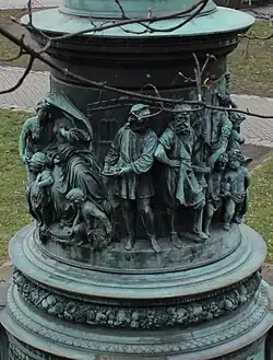 As early as February 1866, the director of the Viennese Imperial-royal artistic foundry in Wieden, Anton Fernkorn, announced his offer to create the monument. The money collection was taking off, among the largest contributors was Lanna's friend, duke Johann Adolf II of Schwarzenberg of Hluboká nad Vltavou.[2] After a break caused by the Austro-Prussian War and the cholera epidemic in České Budějovice,[3]: 27 another meeting of the Committee was held. This meeting was also attended by Wenzel Rosenauer – deputy of the Imperial Council, who lived mostly in Vienna. There he managed to obtain promises of further significant financial resources, among others, from the procurator of the Lanna company, Moritz Gröbe, and Anton Banhans (the future Minister of Agriculture). At that time, the Committee was still hesitant about who to entrust the creation of the monument to. In the end it was awarded to the Imperial-royal foundry in Wieden, which – in the meantime – had been taken over from Fernkorn by his successor Franz Pönninger. In July 1868, Pönninger sent his first proposal from Vienna, which already included the cylindrical pedestal covered by reliefs, on which the statue of Adalbert Lanna the Elder would stand. Further modifications were made during the course of the project,[notes 1] but finally in March 1874 Franz Pönninger committed to a final budget of 20,500 florins and the deadline for the erection of the monument was set on the autumn of the following year.[2]