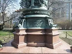 Above the granite pedestal sits a bronze pedestal with four text tablets separated by volutes. On the south (front) side is the inscription Adalbert Lanna. On the east and west sides there are in both cases four lines of text.