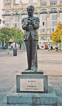 Federico García Lorca or the Monument to Federico García Lorca is an instance of public art in Madrid, Spain. Located at the Plaza de Santa Ana, in front of the Teatro Español, it consists of a bronze statue of the aforementioned poet and playwright.