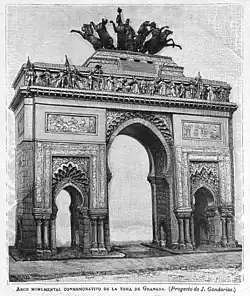 In the case of Granada, a bombastic triumphal arch featuring a mashup of Aztec, Hispano–Arab and Renaissance styles sketched by Justo de Gandarias was tentatively proposed as project for the commemoration of the 400th anniversary.[2] However, even after asking for funds to the Government of Spain, the Ayuntamiento de Granada did not have even a fraction of the budget needed to carry out such an expensive large-scale endeavor, so a public contest for a new project was called.[1] After the contest was declared void, Prime Minister Cánovas del Castillo personally took action and awarded the design to Mariano Benlliure.[3]