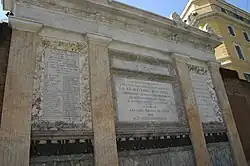 After the breach, a wall was rebuilt with brick and a plaque recalling the event was placed facing outward. Further plaques were added in 1900. On the 25th anniversary of the breach, the City Council of Rome, commissioned from the sculptor Ettore Ferrari, another plaque, recalling the Italian soldiers who had died during the brief attack on the city, and planned for the erection of a tall corinthian memorial column with a bronze winged victory holding a palm leaf atop. The monument was not inaugurated until 20 September 1920, fifty years after the event. Giovanni Battista Giovenale, Giuseppe Guastalla and Adolfo Apolloni completed some of the sculptures. The wall has now four doric pilasters flanking the plaques, with a lower bronze frieze depicting eagle-shields and swords. The marble frieze above shows palm leaves, helmets, and above at the roofline, four antefixes flanked below by lion heads.[1]