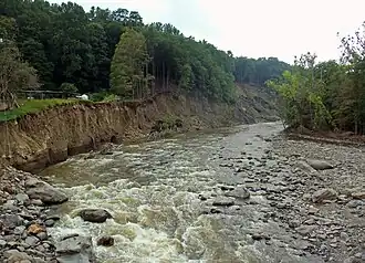 Hurricane Irene caused the creek to swell, coming nearly to the platform of the 9W bridge,[16] and washing out an area at the Forge Hill Road bridge.[17][18] This caused the closing of part of Butternut Drive, and all of Forge Hill Road, except the easternmost 640 feet (200 m), from Route 9W to Staples Lane. The portion east of Staples Lane remains open to local traffic, until the east end of the bridge, which is unstable. One house on Butternut Lane has been condemned, and the property fenced off, due to the dangerous dropoff on the property.[19] The road was not rebuilt and reopened until the late 2010s.