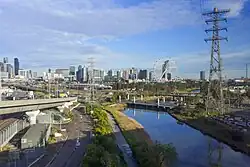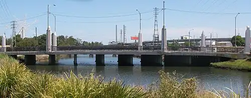 In 2002 the downstream end of the creek was realigned, to accommodate development of Victoria Dock at the Port of Melbourne. Moving the confluence with the Yarra River about 600 metres upstream, the creek mouth once located at the east end of Appleton Dock was removed, with a new watercourse dug leading directly south parallel with the Bolte Bridge approach spans.[3] The realignment created a buffer zone between the port and the Melbourne Docklands residential and commercial areas.[4] While realigning waterways is not a preferred option for Melbourne Water, the work was permitted as previous modifications had left the creek lacking a "true remaining 'natural' alignment" in the area.[3]