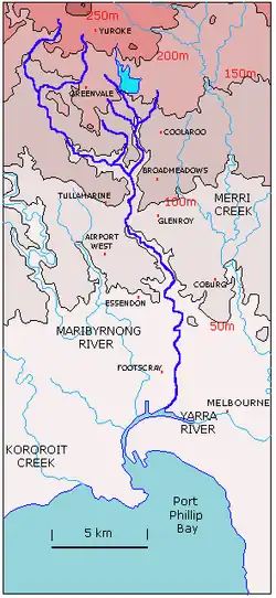 It winds its way through the suburbs of Westmeadows, Meadow Heights, Tullamarine, Broadmeadows, Gowanbrae, Glenroy, Strathmore Heights, Oak Park, Strathmore, Pascoe Vale, Pascoe Vale South, Essendon, Brunswick West, Moonee Ponds, Ascot Vale, Flemington, Parkville, North Melbourne (where its artificially widened section is named Railway Canal) before joining the Yarra River at Melbourne Docklands.