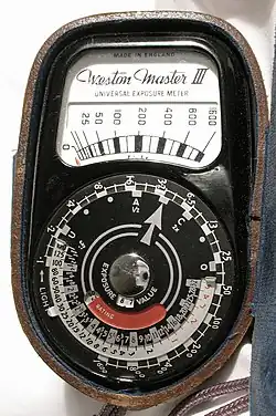 An example of a Weston exposure meter. An average light reading is obtained from the device and the arrow on the circular panel is rotated across the value, yielding a range of aperture and shutter speed combinations that would properly expose the scene.[a]