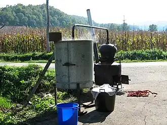 Moonshining has always been popular in the southeastern part of the United States, especially in farm communities, partly because farmers have the produce (corn, barley, apples, grapes, etc.) to make illegal liquor. In some cases, farmers use produce they cannot sell to make moonshine for a profit.[40] Lengthy prison sentences for those caught manufacturing or distributing illegal alcohol makes moonshiners conceal their still sites in secret locations. Stills are unique contraptions that typically consist of several metal drums, copper pipes, and heat sources that heat the mash of sugar, starch and fruit or grain product. The weight and overall size of stills makes concealment difficult.[41] This has led many moonshiners to hide their still sites in very clever locations; most of these moonshiners take refuge deep in the backwoods of America, in abandoned barns in addition to underground structures and tunnels. A classic example of underground still sites that are still being utilized today is the usage of old abandoned mining tunnels.[42] This idea is said to have started in the old mining caves in Tennessee soon after the civil war. Illegal distillers would use these caves because it provided adequate cover that protected them from being discovered by law enforcement officers. American moonshiners also preferred the use of caves due to the natural abundance of water that the caves provided; which is a key ingredient of moonshine. These caves were used to manufacture moonshine until well into the 20th century.[43]