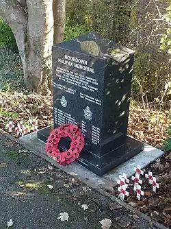 Despite eyewitnesses reporting engine failure, official reports into the crash squarely blamed the 20-year-old pilot Denis Evans.[7] However it is now believed that a known design issue with the Halifax was the main cause.[5] In 2010, Moordown councillor Sue Anderson advocated a permanent memorial as part of Bournemouth's bicentennial.[8] In 2011, a memorial was unveiled to commemorate the air crash.[9] The 70th anniversary was marked at the memorial.[10] In 2024, the 80th anniversary was marked.[11] There is a website dedicated to the Moordown Halifax Memorial which can be accessed here: https://www.jp137.com