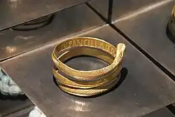 On the inside of the bracelet is an inscription, near the head of the snake,[11] reading "dom(i)nus ancillae suae"[12] ("the master to his very own slave girl").[13] The words are divided by interpuncts, and "II" is used in place of "E".[14] It is not possible to determine when the bracelet was inscribed.[15]