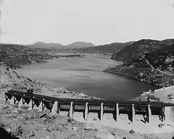 The dam was first proposed in the 1880s by the Southern California Mountain Water Company, which envisioned a system of reservoirs and connecting pipelines to transport water from the Tijuana and Otay river basins to San Diego.[9] A bond issue was approved in 1896 for construction of Morena Dam, which would form the highest and most remote of the reservoirs. Construction began in fall 1896, directed by San Diego city engineer Edwin Capps. The initial construction was fraught with problems caused by leakage and poor engineering, and work stopped in April 1898. It was not until May 1909 when construction resumed, under engineer Michael O'Shaughnessy.[9] The job was finally finished in 1912, at a cost of about $1.5 million.[10]