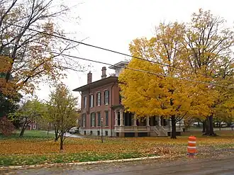 The Morgan–Manning House is a historic house located in Brockport, Monroe County, New York. It was built in 1854 and is a two-story, Italianate–style brick dwelling on a limestone foundation. The five-by-four-bay main block features a hipped roof and cupola. It has a two-story hipped roof wing with a smaller two-story brick appendage creating a stepped, or telescoping, plan or profile. The house also has a full width porch with brick piers. The interior features elaborate interior woodwork, period plasterwork, stained glass and decorated ceilings. Also on the property is a contributing carriage house.[2]