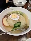 Morioka reimen (Japanese: 盛岡冷麵) is a local dish of Morioka, Iwate Prefecture. It is a cold noodle dish and one of the three great noodles of Morioka, along with Morioka jajamen and Wanko soba. It is known for its chewy noodles, rich chilled broth, and toppings of kimchi.[1] It is based on the Korean dish naengmyeon.