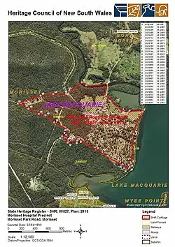 - ^ a b c d e f g h i j k l m n o p q r s t u v w x y "Morisset Hospital Precinct". New South Wales State Heritage Register. Department of Planning & Environment. H00827. Retrieved 2 June 2018.