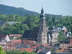 Morizkirche (or Stadtkirche St. Moriz) is a Protestant church dedicated to Saint Maurice in Coburg, Bavaria, Germany, and is the town's oldest church. Its earliest remaining structures date back to the 14th century, which superseded a church from the 12th century. Martin Luther is known to have given several sermons there in 1530 A.D. This church currently houses the family tomb of the Dukes of Coburg. In modern times, Morizkirche serves as the main church for the congregation of St. Moriz. Due to the height of its towers, the church is one of the landmarks of Coburg. It is also one of the most important Luther memorial sites in southern Germany.[1]: 47–48