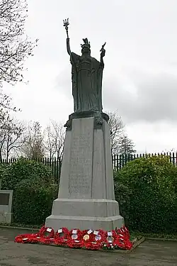 The memorial consists of a bronze statue surmounted by a granite plinth. The statue portrays Britannia in a Roman dress holding a trident aloft in her right hand and a statue of a winged man kneeling on one knee in her left hand, symbolising "victory." Located on her bodice is the royal emblem of three rampant lions, she is also wearing an elaborate plumed helmet with seahorses to either side. It is 22 feet tall, including both the statue and plinth.[6]