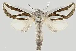 In males, the mean forewing length is 16 mm and the mean wingspan is 35 mm. The head, thorax, abdomen, and tegulae are grey. The antennae are bipectinate and roughly half the length of the forewing. The forewing is black with a white silvery pattern made up of three white silvery patches. A fascia of even width runs along the entire costal margin, with the median fascia widening medially and reaching the outer margin of the forewing. The lower silver patch originates at the basal edge and extends along dorsal wing margin to middle. This patch is enclosed by ground colour. The adterminal line is white and the fringe is grey. The dorsal surface of the forewing is greyish-white, with greyish-black costal, outer, and dorsal margins. The hindwing is uniformly white with a greyish-black spot at the costal margin.[1]