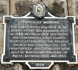 It was not until 1586 that Morong had a friar named Blas de la Madre de Dios assigned as first minister of the pueblo. He constructed a wooden church on the south bank of the river, but it was burned down together with a large part of the pueblo in 1612. After three years, a new church was built of stone and mortar on elevated ground at the opposite bank of Morong River which ensured its safety from floods and fires. It measured 42 varas long by 12 varas wide, had a single nave with semi-circular apse, built under the direction of Chinese master craftsmen.[1] The church, dedicated to Saint Jerome, was completed in 1620. The church had remained substantially unchanged until 1850–53, when Máximo Rico commissioned Bartolomé Palatino, a native of Paete, to renovate the facade and build a bell tower.