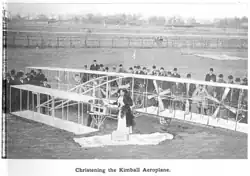 A report in the April 1909 issue of Aeronautics Magazine described new aircraft (referred to as "machines") that were being planned or under construction by at least twenty members of the Society and would be exhibited at Morris Park in the spring of that year. The report noted that Anna Held christened the first aeroplane constructed entirely at Morris Park.[16] The magazine had previously observed that Americans often named their aircraft, contrary to the European habit of numbering them: "Flying machines have a something that is akin to a personality, and giving them names, even if it does not help us to realize their individuality, and perhaps it may, at least it helps in a curiously subtle way to popularize them." The craft christened on March 14 by Held was Wilbur R. Kimball's "N. Y. No 1" and the ceremony was believed to be the first time a aeroplane had ever been christened.[1]