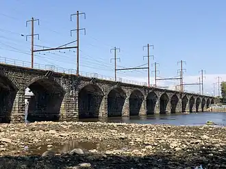 A series of Pennsylvania Railroad (PRR) predecessors operated trains across the nearby Lower Trenton Bridge from 1834 until 1903, when PRR completed a grade separation project through Trenton, including this stone arch bridge on a new alignment.[1]