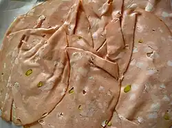 Mortadella[1] (Italian: [mortaˈdɛlla]) is a large salume made of finely hashed or ground cured pork, which incorporates at least 15% small cubes of pork fat (principally the hard fat from the neck of the pig). It is traditionally flavoured with peppercorns, but modern versions can also contain pistachios or, less commonly, myrtle berries. The sausage is then cooked.