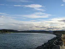 Moruya River looking upstream from the breakwater on the northern head of the river. | |