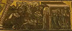 | Jacob Meets Joseph | It differs from the preceding scenes by a richer palette of colours, though this could be due to a different mosaicist, whilst its lively composition in almost pathetic tones may attribute them to the Master of the Maddalena (Pesenti, 1978–1979). |