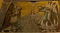 Noah and the Animals Enter the Ark | Double scene, showing a certain modernity in the animals. Ponticelli attributed it to a 1483–1499 intervention by Alesso Baldovinetti, inspired by Paolo Uccello's frescoes Scenes from the Life of Noah in the Chiostro Verde of Santa Maria Novella. Roberto Longhi instead argued the mosaic was earlier than the fresco, with the latter drawing on the former. Soulier noted Egyptian or Syriac influence. |