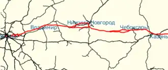 The Moscow–Kazan high-speed railway is a planned 772-kilometre long high-speed railway line connecting the cities of Moscow and Kazan in the Russian Federation, going through the intermediate cities of Vladimir, Nizhny Novgorod and Cheboksary. The project had an original expected completion date of 2018 (as of 2013),[3] and Government of China intended to make the project the first segment of transnational high-speed railway that connect Beijing and Moscow over a distance in excess of 7,000 kilometres.[4] Planning work was finished in September 2017. Preliminary construction on stations and platforms, with space reserved for the railway, started in spring 2018.[5] Construction on the railway has been postponed as of March 2020, due to the high cost (estimated at 1.7 trillion rubles) and in lieu of further studies on ridership.[6] As of 2025, the construction has still not started.