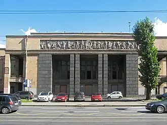 The main façade is adorned with a portico featuring pylons clad in dark gray granite from the Zhezhelevsky quarries. The portico is topped by an attic with a bas-relief made of cement mixed with cast iron filings (created by I. V. Krestovsky).[1] According to the author himself, all the figures on the frieze represent real people, although the likeness is not always exact. The female sculptor is Janson-Manizer, the painter is Samokhvalov, and the ballerinas — the three Auroras from The Sleeping Beauty — are Ulanova, Vecheslova, and Dudinskaya. The figure "at the piano" is Preobrazhenskaya, and the one with a camera is Strekalov-Obolensky (the only one depicted with precise facial features).[4]