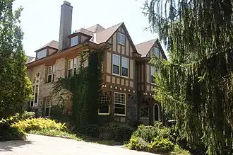 Moss Hill stands on a wooded and hilly lot on the east side of Litchfield Road, south of Norfolk village. It is a large 2+1⁄2-story structure, built of stone and stucco with half-timbered gables in the Tudor Revival style. Its main block is covered by a hip roof with paired gables set in the short ends. A 2+1⁄2-story ell extends eastward from the main block, and a gabled entry section projects slightly at the center of the western facade. The stonework is of a generally large scale, and appears to have been quarried on site. Windows are typically sash, with a large single pane in the lower sash and multiple small panes in the upper. The interior has well-preserved Beaux Arts features. Some of the upper-level windows have heavy wooden balconies outside them.[2]