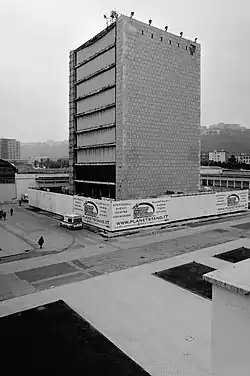Made in 1940 by Venturino Ventura after winning the competition. The tower is a squat parallelepiped 24.50 m (80.4 ft) long by 42 m (138 ft) high, it rests on a base, originally decorated with bas-reliefs that exalted the regime by Pasquale Monaco and Vincenzo Meconio; the structure is characterized by the presence of two solid fronts in travertine that alternate with the empty elevations. The interior is characterized as a single room served by the elevator and stair block located in the center. Interesting is the play of the reinforced concrete overhangs of the floors, which at the time were considered daring due to the available calculation technology. It is currently being recovered on a project by the Corvino+Multari studio.[4]