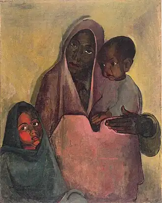 Mother India is an oil on canvas painting by Hungarian-born Indian artist Amrita Sher-Gil (1913 – 1941), completed in May/June 1935 in Simla. The painting depicts an Indian peasant mother with her son and daughter, and was one of 33 of Sher-Gil's works displayed at her successful solo exhibition at Faletti's Hotel in Lahore, British India, held in 1937. There it was priced at ₹500. Under India's Antiquities and Art Treasures Act (1972), the work is a national art treasure and must stay in the country.[1][2][3][4][5][6]