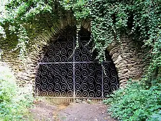 Mother Ludlam's Cave, also known as Mother Ludlum's Cave or Mother Ludlum's Hole, is a small cave in the sandstone cliff of the Wey Valley at Moor Park, near Farnham, Surrey, in England. The cave is the subject of a number of local legends. A spring rising in the cave is recorded in the 13th century "Annals of Waverley Abbey" as "Ludewell"; other spellings through history include "Ludwell" and "Luddwelle". A monk named Symon is credited with identifying the spring as a suitable water supply for Waverley Abbey in 1218, after the original source had dried up.[1] The brothers of the abbey dedicated the spring to St Mary, so it also became known as St Mary's Well. The cave has been naturally formed by the spring but may have been enlarged by the monks and was made into a grotto (possibly during the eighteenth century) and further enhanced by addition of an ironstone arched entrance, possibly during the reign of Queen Victoria.