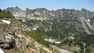 Mother Mountain is a 6,480+ ft (1,980+ m) multi-summit, 3-mile long ridge-like mountain located in Mount Rainier National Park, in Pierce County of Washington state.[4] It is part of the Cascade Range, and lies 7 mi (11 km) northwest of the summit of Mount Rainier. The Wonderland Trail provides one approach option to this mountain, and the summit offers views of Mount Rainier. East Fay Peak is its nearest higher neighbor, 0.42 mi (0.68 km) to the south.[1] Precipitation runoff from Mother Mountain is drained by Cataract Creek on the south side of the mountain, and Ipsut Creek drains the north side of it, and both are tributaries of the Carbon River. The west side drains into Mowich Lake, and thence Mowich River.