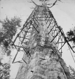 At the time of the California Gold Rush, prospectors were searching the state for undiscovered riches. As photography wasn’t developed enough yet to satisfy people’s curiosity, trees were felled and transported to big cities to prove their existence at great costs.[6] In 1854 after unsuccessful exhibitions of the Discovery Tree, William Lapham, George L. Trask and George Gale set about to have the bark from the trunk of the Mother of the Forest removed, ready to be reassembled at exhibitions. Workers made holes in the tree using pump-augers, and inserted rods into the holes to support the weight of the scaffolding and the workers while the bark was sawed off.[7] Over 90 days, 60 tons of bark were removed in 8 feet (2.4 m) high and 2 to 5 feet (0.61 to 1.52 m) wide sections up to the height of 116 feet (35 m).[8] The bark was 18 inches (46 cm) thick at the base,[5][9] and on average 11 inches (28 cm) thick.[7] Gale sent samples of the tree to foresters in the east where it was discovered to be 2,520 years old.