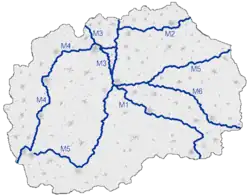 The system has inherited some from the former Yugoslavia, although new sections have been completely built in the recent years. Pay-tolls (Macedonian: patarini) remain in place and the speed limit is 130 km/h (81 mph).[1] The total length of the motorway network as of February 2025 is 317 km,[2] with extra 167 km being under construction. The works on the first couple kilometers of the motorway from Skopje to Kosovo's border started in 2020. The extension of the A2 motorway from Kicevo to Ohrid started in 2014. The part that is supposed to connect Gostivar and Bukojchani, Prilep and Bitola and Trebenishta and Kjafasan started construction by consortium Bechtel & Enka in 2024.[3][4] Furthermore, most stretches of the existing network have been reconstructed, so overall the Macedonian motorways are in decent shape.[5]