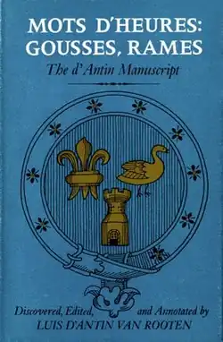 Mots d'Heures: Gousses, Rames: The d'Antin Manuscript (Mother Goose Rhymes), published in 1967 by Luis d'Antin van Rooten, is purportedly a collection of poems written in French with learned glosses. In fact, they are English-language nursery rhymes written homophonically as a nonsensical French text (with pseudo-scholarly explanatory footnotes); that is, as an English-to-French homophonic translation.[1] The result is not merely the English nursery rhyme but that nursery rhyme as it would sound if spoken in English by someone with a strong French accent. Even the manuscript's title, when spoken aloud, sounds like "Mother Goose Rhymes" with a strong French accent; it literally means "Words of Hours: Pods, Paddles."
