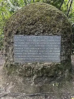 Motuara Island is a scenic and historical reserve that lies at the entrance to Queen Charlotte Sound / Tōtaranui.[1] It is notable for the actions of James Cook. During HMS Endeavour's stay at nearby Meretoto / Ship Cove, Cook climbed to the summit of Motuara, and formally (and controversially) claimed it and the adjacent lands in the name of and for the use of the sovereign of the British Empire.[2][3][4]