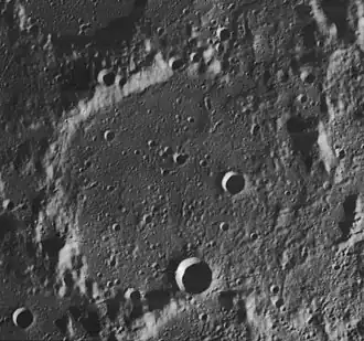 Attached to the exterior of the southern rim is a smaller replica of Mouchez, forming a curving ridge. Attached to the northern exterior is the flooded crater Mouchez A, which has a nearly intact rim with gaps along the northwestern side.