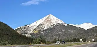 Mount Bethel is set two miles (3.2 km) east of the Continental Divide in the Front Range which is a subrange of the Rocky Mountains.[1] It is an iconic landmark viewed from westbound Interstate 70 as travelers approach the Eisenhower Tunnel. The mountain is located 50 miles (80 km) west of Denver on land managed by Arapaho National Forest. Precipitation runoff from the mountain's slopes drains into headwaters of Clear Creek which is a tributary of the South Platte River. Topographic relief is significant as the summit rises 2,300 feet (701 m) above the creek and Interstate 70 in one mile (1.6 km). Snow fences are a distinguishing feature on the mountain's slopes which are there to mitigate avalanches from threatening the Interstate. An ascent of the peak involves hiking four miles (6.4 km) with 2,680 feet (817 m) of elevation gain.[5]