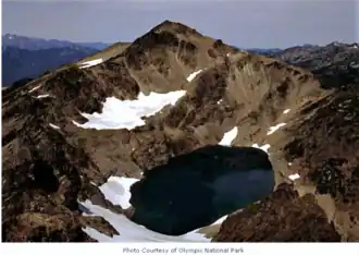 The Olympic Mountains are composed of obducted clastic wedge material and oceanic crust, primarily Eocene sandstone, turbidite, and basaltic oceanic crust.[8] The mountains were sculpted during the Pleistocene era by erosion and glaciers advancing and retreating multiple times.