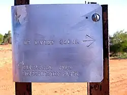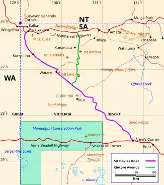 Mount Davies Road is a remote unsealed outback track which runs from Mount Davies (Pipalyatjara) in the far north-west corner of South Australia to Anne's Corner on the Anne Beadell Highway 397 kilometres (247 mi) to the south-east.[3] It was built during 1956 and 1957 by the Gunbarrel Road Construction Party (GRCP) surveyed and led by Len Beadell, for the Weapons Research Establishment at Woomera, South Australia.[4]