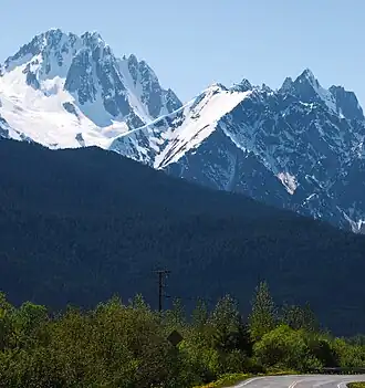 Mount Emmerich is located nine miles (14 km) west-southwest of Haines in the Chilkat Range which is a subrange of the Saint Elias Mountains.[1] Precipitation runoff and glacial meltwater from the mountain's slopes drains to the Chilkat River via the Takhin and Kicking Horse rivers. Although modest in elevation, topographic relief is significant as the summit rises 5,377 feet (1,639 meters) above the Garrison Glacier in 1.5 mile (2.4 km). The first ascent of the summit was made on August 14, 1976, by Fred Beckey, Craig Zaspell, and Jack Tackle via the southwest ridge.[6] The mountain's toponym has been officially adopted by the United States Board on Geographic Names.[1] The mountain was named by the United States Coast and Geodetic Survey in 1897,[1] to remember one of their own, Lieutenant Charles F. Emmerich (1849–1894), who served on the schooner Hassler in Alaska in 1893.[7] According to the U.S. Geological Survey, this landform's local name is Cathedral Peak, "because of the mountain's prominence and cathedral-like appearance."[8]